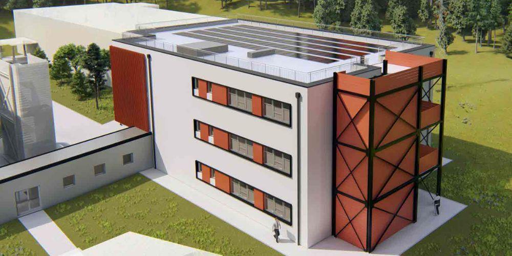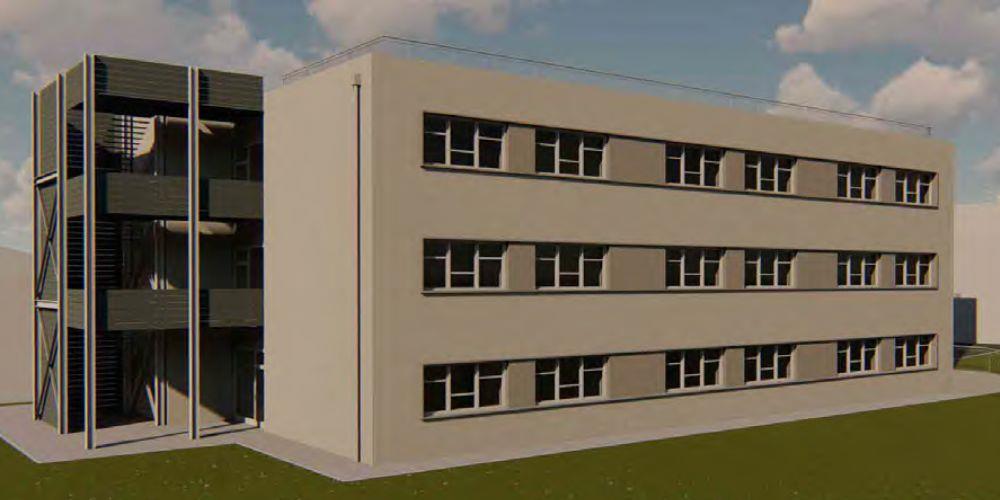 In coerenza con l’impianto esistente dell’edificio, che è già costituito da una serie di volumi principali collegati da elementi leggeri e vetrati di raccordo, ed in ottemperanza alla richiesta di impermeabilizzare la minor quantità possibile di suolo, si è effettuata la scelta progettuale di un volume compatto, a pianta regolare, di forma sostanzialmente rettangolare. L’edificio si caratterizza così per la semplicità dei volumi e l’omogeneità dei fronti e si rapporta con linearità alle pre-esistenze senza risultare in contrasto stridente.