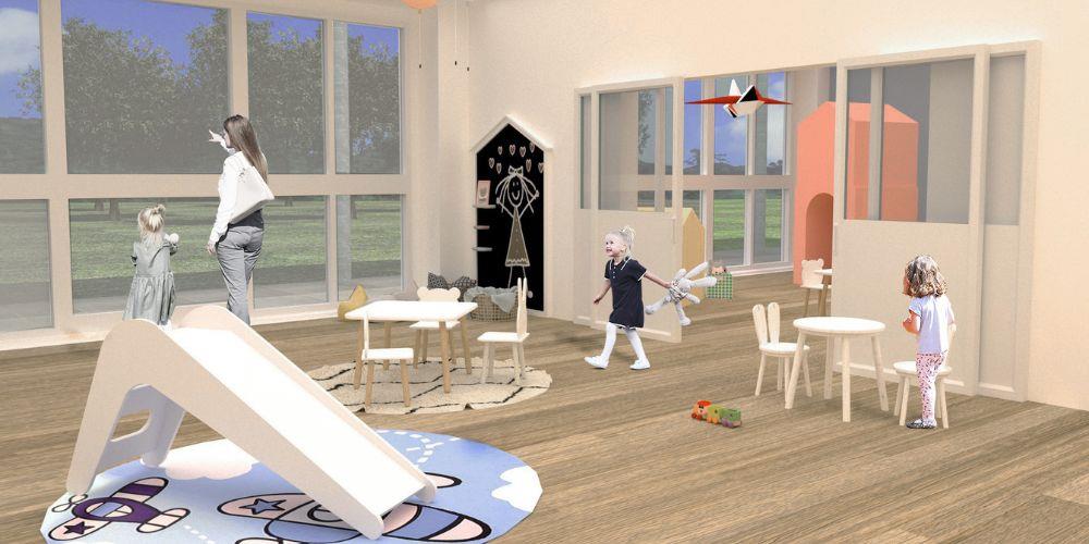 L’intervento prevede l’inserimento di 3 classi per la nuova scuola dell’infanzia formate da 18 alunni ciascuna tra i 3 e 5 anni per un totale di 54 bambini. Gli spazi dedicati alle attività scolastiche si svolgono in 3 locali. Per due di queste nuove aule si prevede un’area di riposo e dei servizi comunicanti, la terza aula non avrà invece la presenza del dormitorio in quanto non necessario dato che verrà utilizzata da bambini di maggiore età. Sul lato nord-ovest è poi prevista un’aula collettiva di maggiori dimensioni da poter utilizzare per attività di gruppo e ad uso ludoteca. Attorno all’edificio si formerà un percorso pedonale pavimentato che sul lato est sarà coperto a portico. La comunicazione diretta dell’aula con il giardino incoraggia la prosecuzione dell’attività didattica negli spazi esterni. Il loggiato esterno svolge così la funzione di filtro tra aula e giardino proteggendo al contempo gli ambienti interni dalla luce diretta.